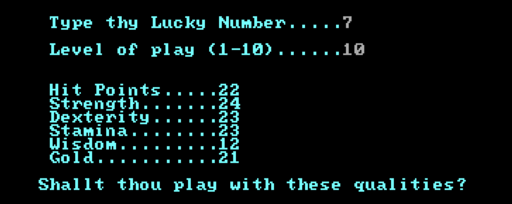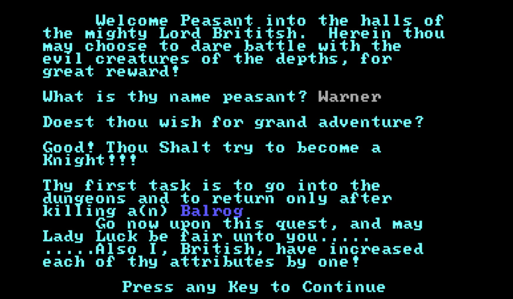 I actually think this is really neat. I've heard from some players of OD&D they didn't name their character until they'd gained a level or two so as not to get too invested in a 1hp wonder that dies at a kobold's cough. Revealing your identity to Lord British both captures that for me since I didn't do it until I'd made a little more of a name for myself and once I'd gotten attached to my goober. Namewise, I'm going to call them Warner. When futzing around with Moria, it just happened to be the first name that came to mind. Considering that dude died super fast in both Moria and Angband as I figured out how to play, I think giving him new life in this would be nice.