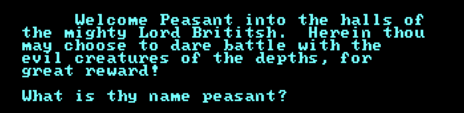 Its funny, I know the later games present you with a naming screen as part of creating a character but here we reveal ourselves by identifying ourselves to Lord British.