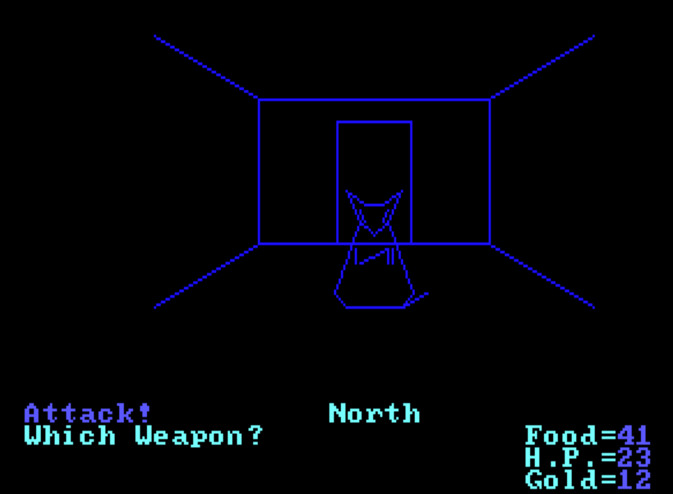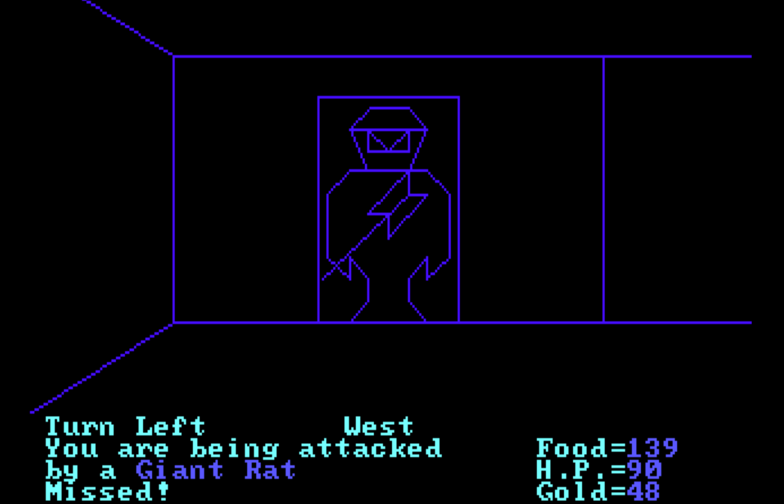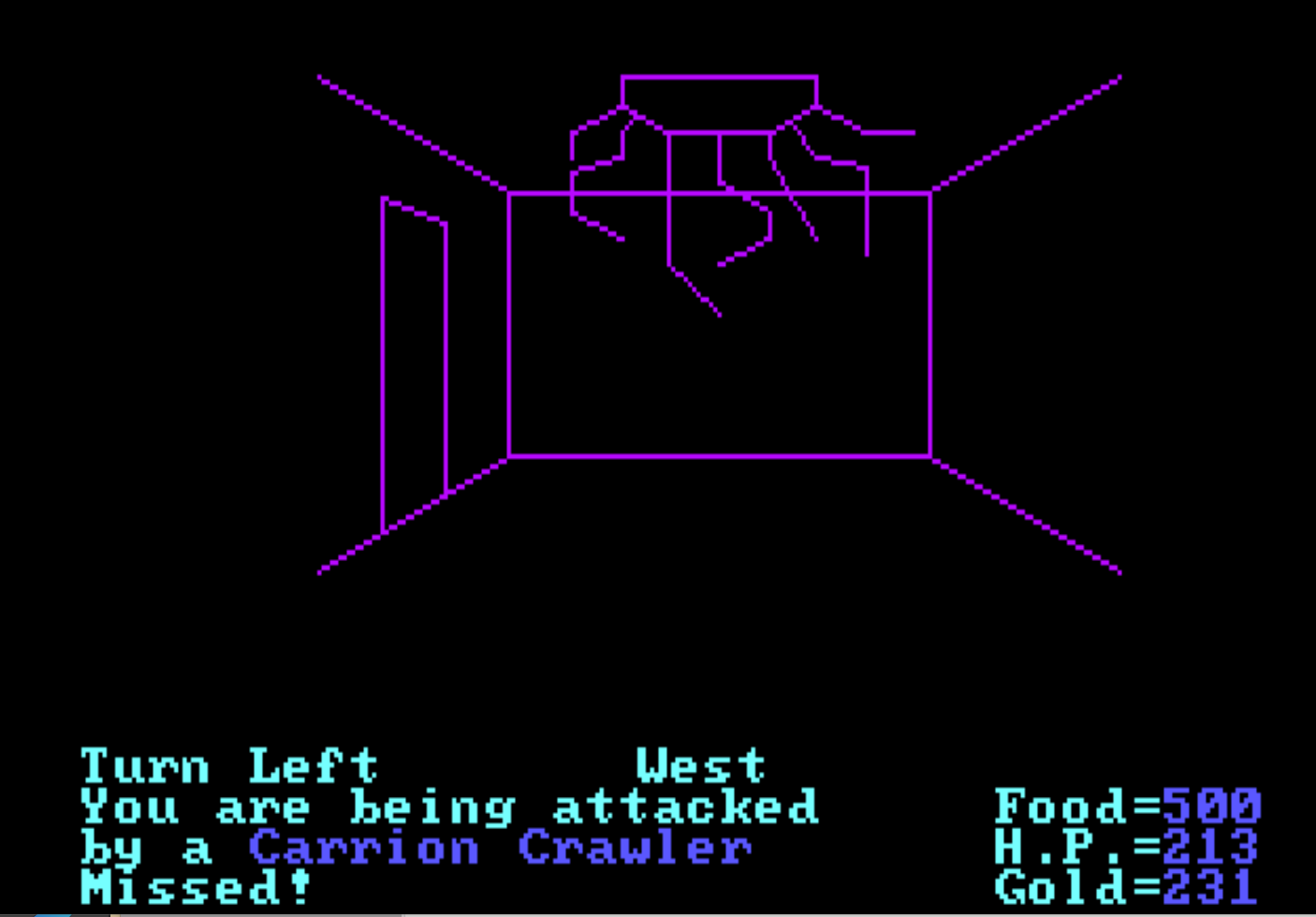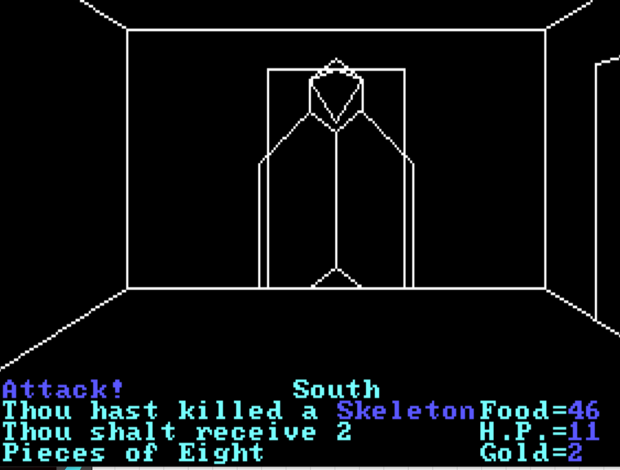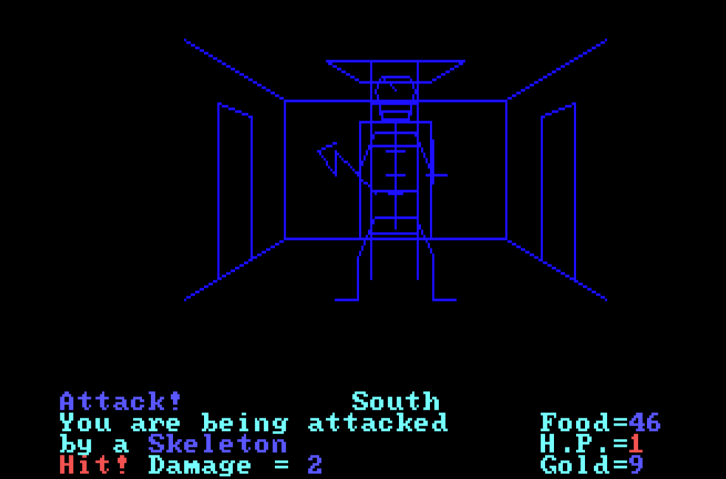 The dungeons are a very gloomy place. I do enjoy the limited wireframe aesthetic, it feels like its something you barely can glimpse in the dark. The music in the DOS version also adds to the unsettling quality of this place. You can gaze up and down the corridors, allowing for you to get shots off with ranged attacks but doors will block visibility until something comes through them. Dungeons are a grid and it feels like the doors take up a tile in themselves. I'll have to keep this in mind as I map. And just as I'm getting my bearings...
