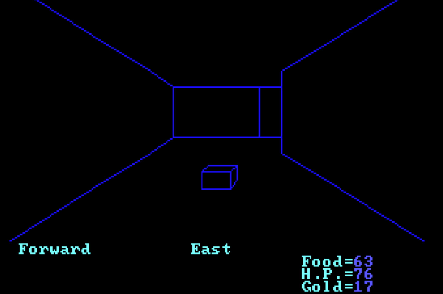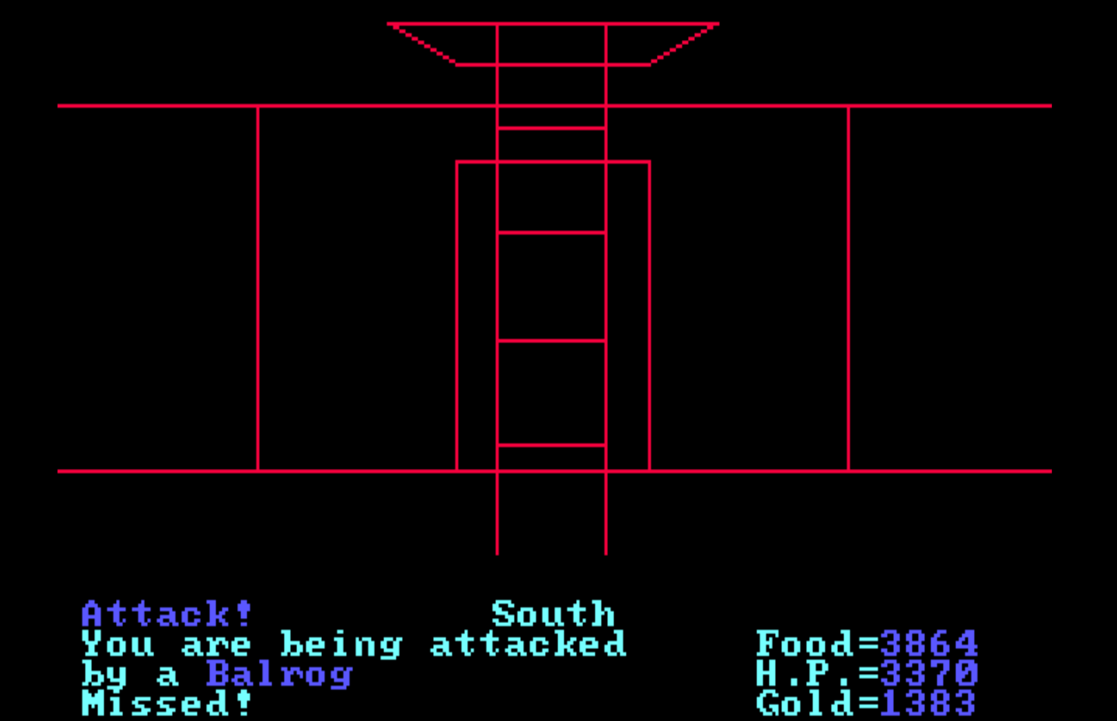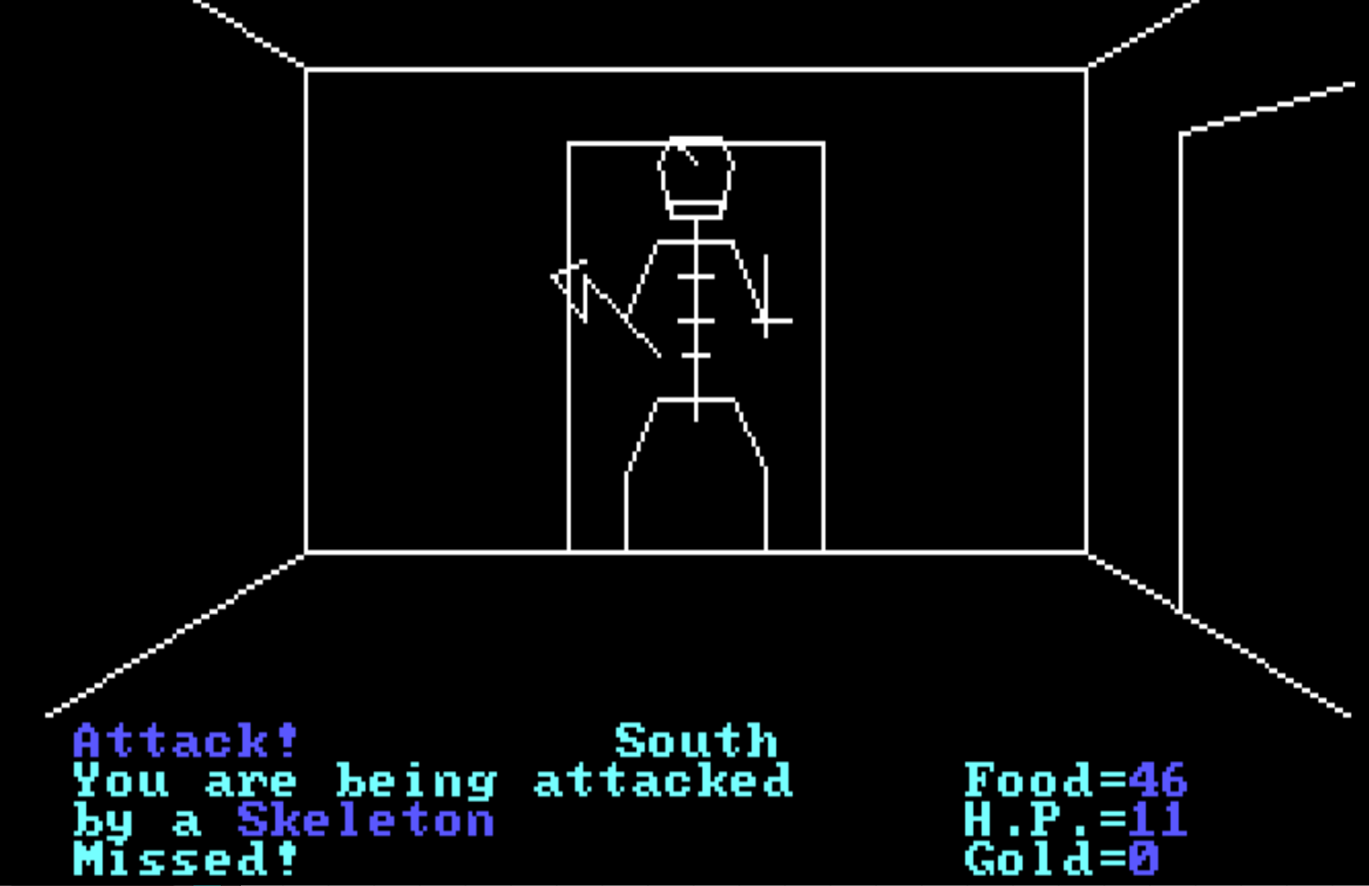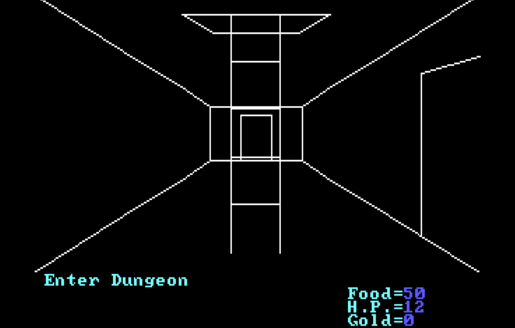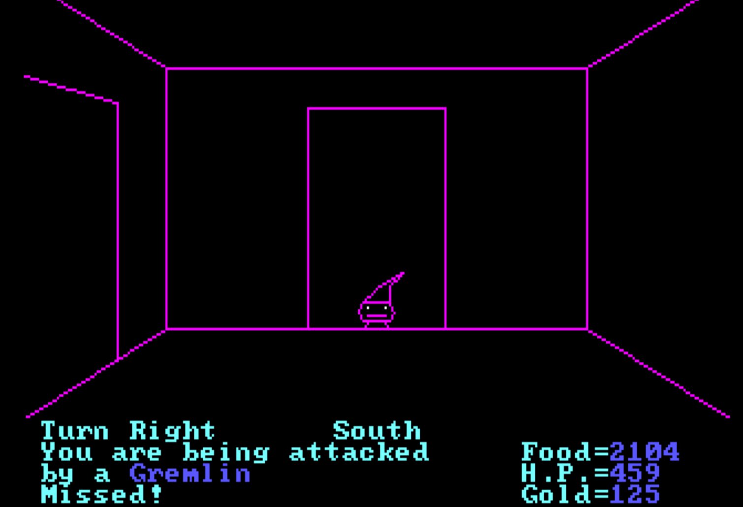The dungeons are a very gloomy place. I do enjoy the limited wireframe aesthetic, it feels like its something you barely can glimpse in the dark. The music in the DOS version also adds to the unsettling quality of this place. You can gaze up and down the corridors, allowing for you to get shots off with ranged attacks but doors will block visibility until something comes through them. Dungeons are a grid and it feels like the doors take up a tile in themselves. I'll have to keep this in mind as I map. And just as I'm getting my bearings...