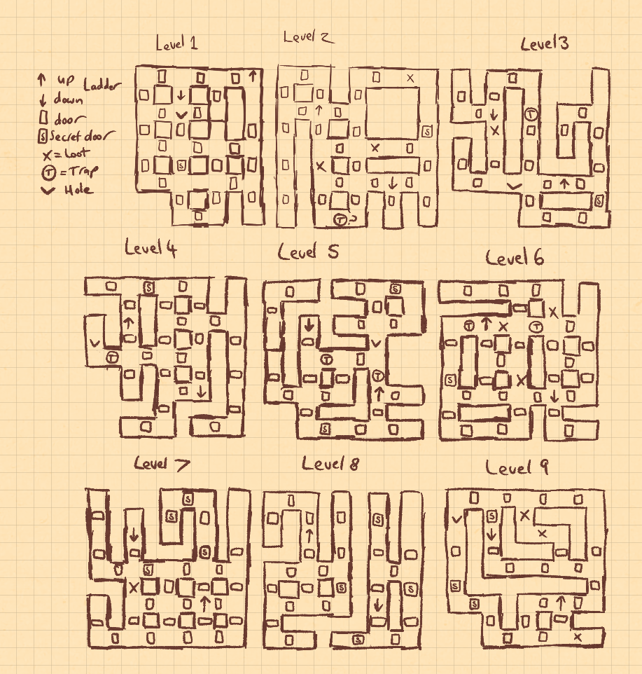 And Level 7! I got absolutely SWARMED coming down the ladder but it turned out alright. I think I'm a bit too strong for the game to threaten me much. I may have missed some spots on the map, however or misaligned something, as the trap from Level 7 should drop the player somewhere around the secret zone.