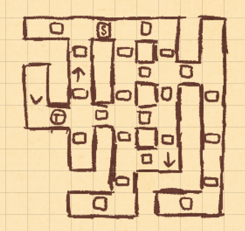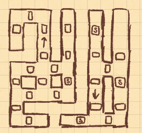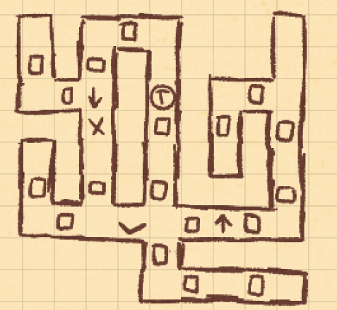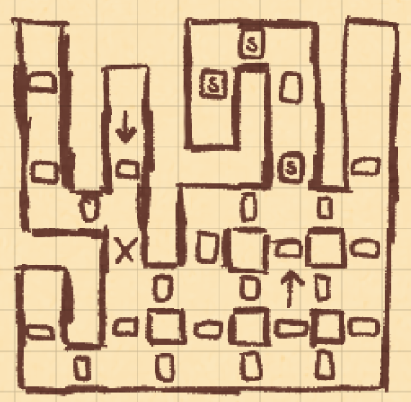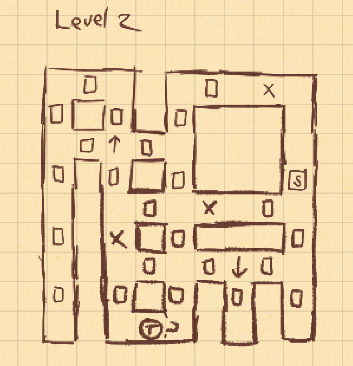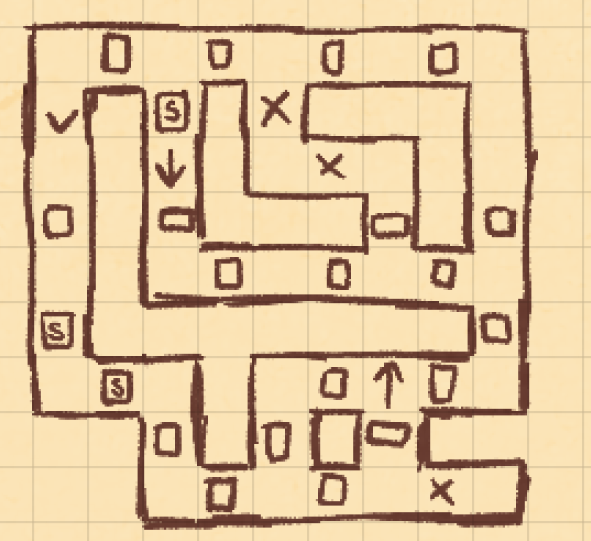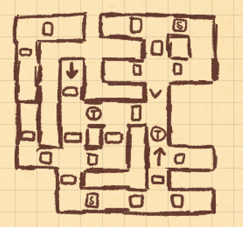 I have a better understanding of the features of the map now as well. Before, there were ladders I thought went up and down and, well, they do - just not on the same floor. If you see a ladder and a pit, that means when you descend, there will be a ladder on the tile you end up on. If you find just a pit, that's a one way trip to the next level, you'll have to find a ladder back up. As such, my notation is now a V for a pit and downward arrow for a pit with a ladder.