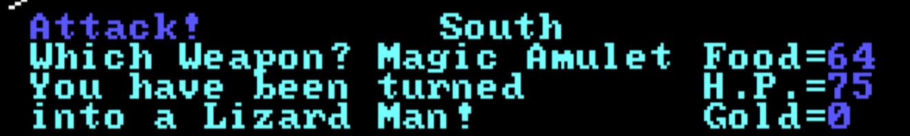 I'm not going to even touch that now, if I mess with it any further it'll be Hell Comes to Frog Town when I encounter the Balrog. I'm pretty sure that 76 damage per attack will get me through the rest of it. Theoretically, if the Balrog is a 10th Level Monster on the 10th Level of the Dungeon at the 10th Level of Difficulty (and I'm the 7th son of a 7th son judging by my power), that equals a whopping 120 HP. Two chops with the axe and it's all over, buckaroo. Say hi to Morgoth for me - in Hell. If only my dear, beloved Gandalf had thought to turn into a lizard man on the bridge of Khazad-dum... I suppose he would have returned as Gandalf the Green then. As my luck holds out, I'm starting to wonder if the Magic Amulets ever actually run out of charges. I haven't run into it yet - or, if I have, I haven't noticed it. I'm swimming in the darn things.