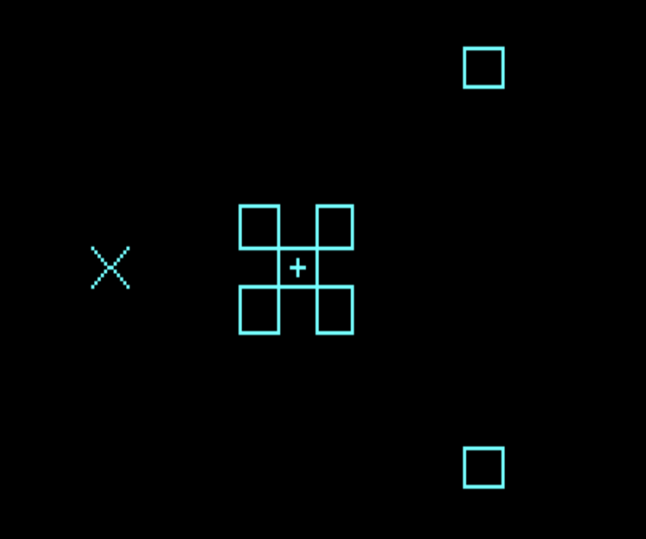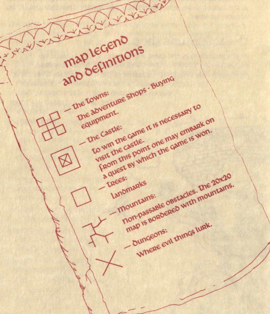 The World of Akalabeth is a rather barren place - though not as much as the screenshot would suggest. The manual notes a few things to help me with figuring out what I'm looking at. The big X made of blocks represents the town, the little X is an entrance to the dungeon, the squares are trees and as yet unseen, we have the Castle and and Mountains that border the area.